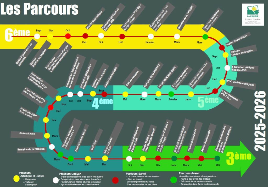 • Le parcours : c’est l’ensemble de projets, articulés, cohérents, diversifiés qui est réalisé dans une temporalité longue, soit un cycle d’enseignement, soit à plus long terme, dans le parcours de vie.